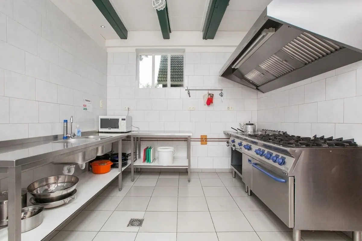 - Grote professionele keuken met spoelafdeling. De keuken is volledig ingericht met vaatwasser, 6-pits gasfornuis, koel- en vrieskast, grote oven, magnetron, kookgerei, borden en bestek. U hoeft zelf niets meer mee te nemen.