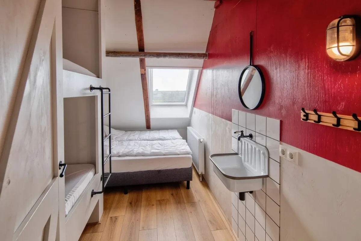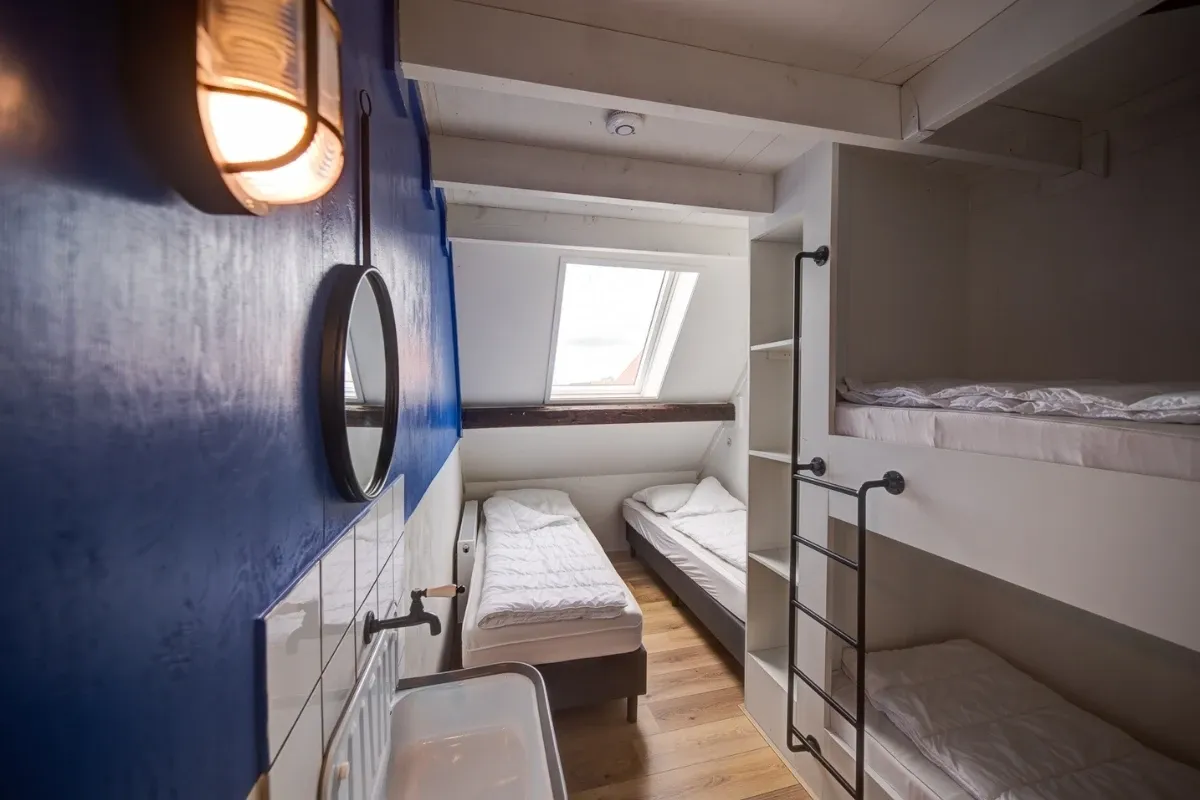 - Kamer 5: 4 persoons kamer = 2 x 1-persoons bed en 2 x 1-persoons boxspring (inclusief eigen wastafel)